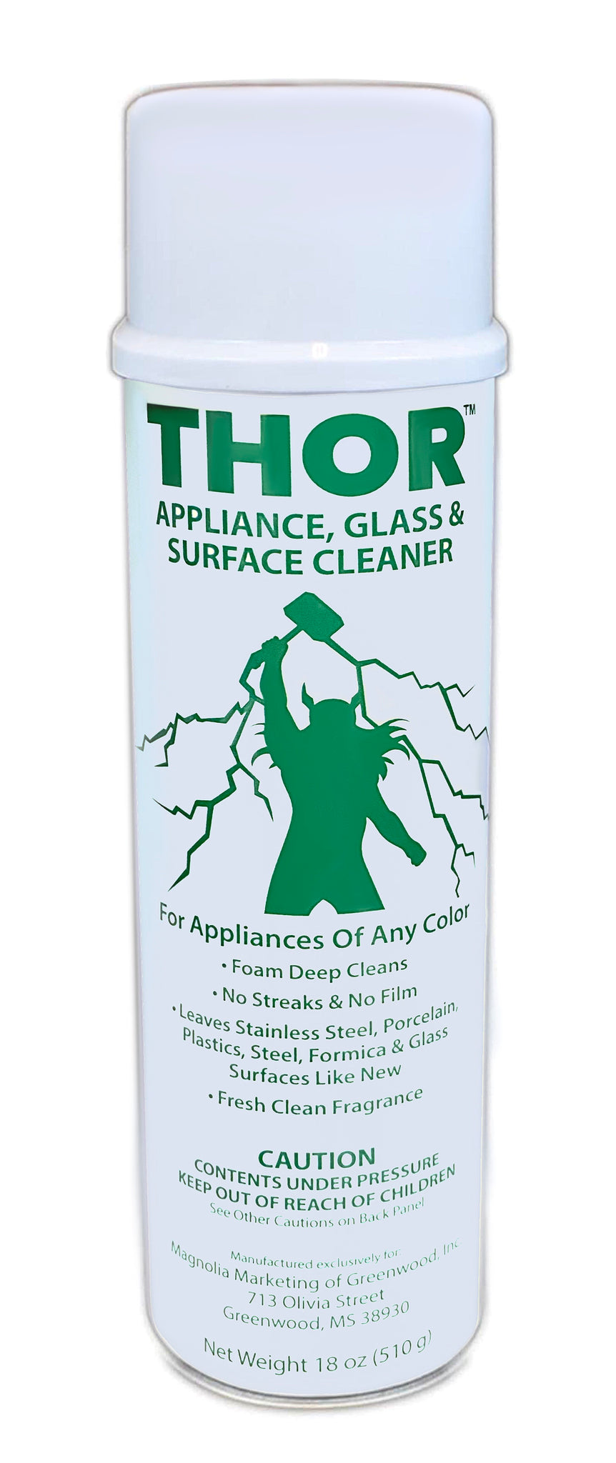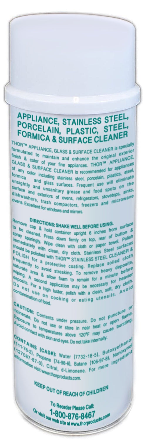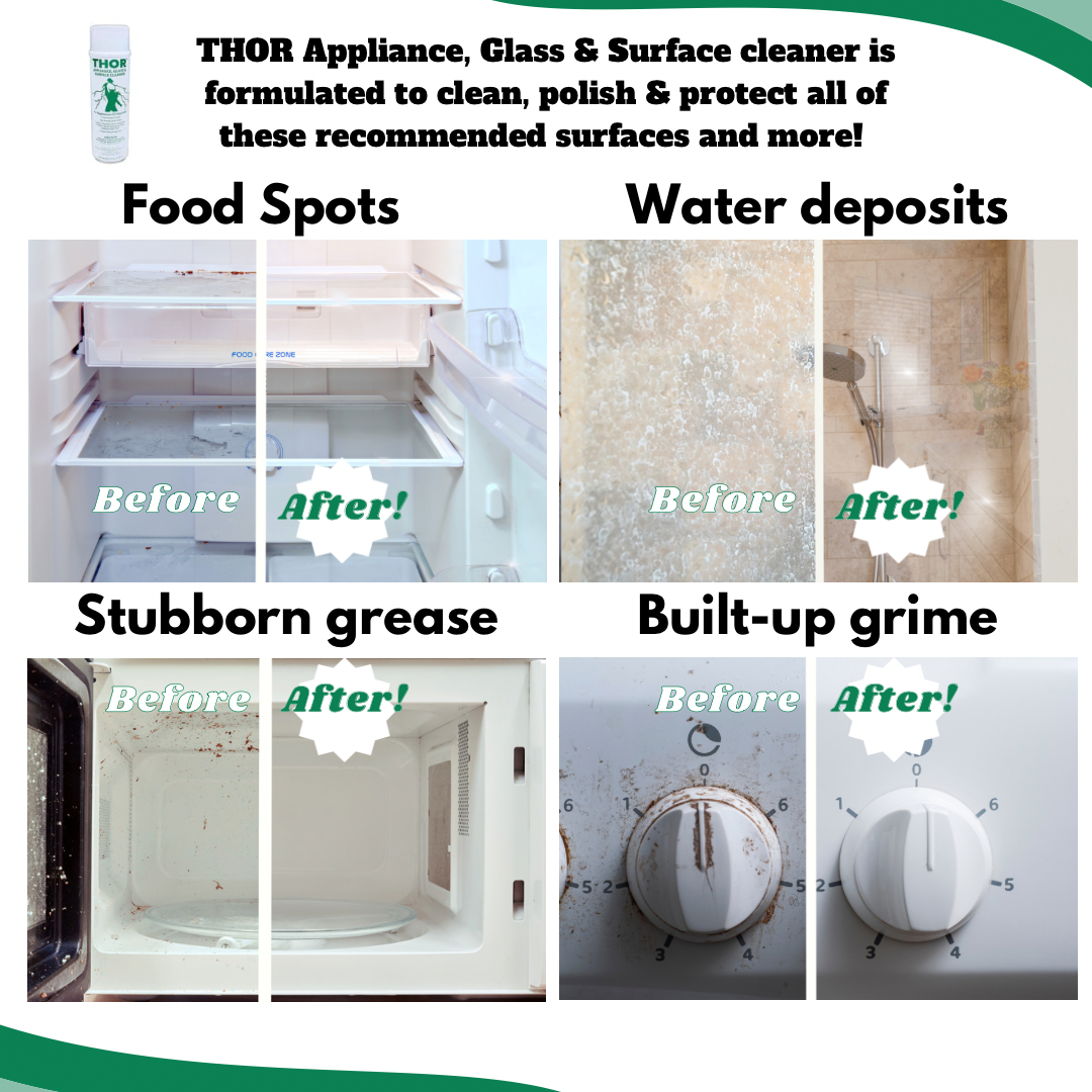 We all know how frustrating it is to see streaks, smudges and dirt on our appliances and glass surfaces. Rest assured that your surfaces will be cleaned, polished and protected with this versatile cleaner! You no longer have to worry about greasy film, abrasive cleaners or potent chemical smells. With Thor Appliance, Glass and Surface Cleaner, you can maintain the original exterior finish of your appliance. Whether your surface is enamel, porcelain, chrome, plastic or glass, this cleaner will take care of grease and food spots. This advanced formula cleaner is even the perfect solution for windows and mirrors.