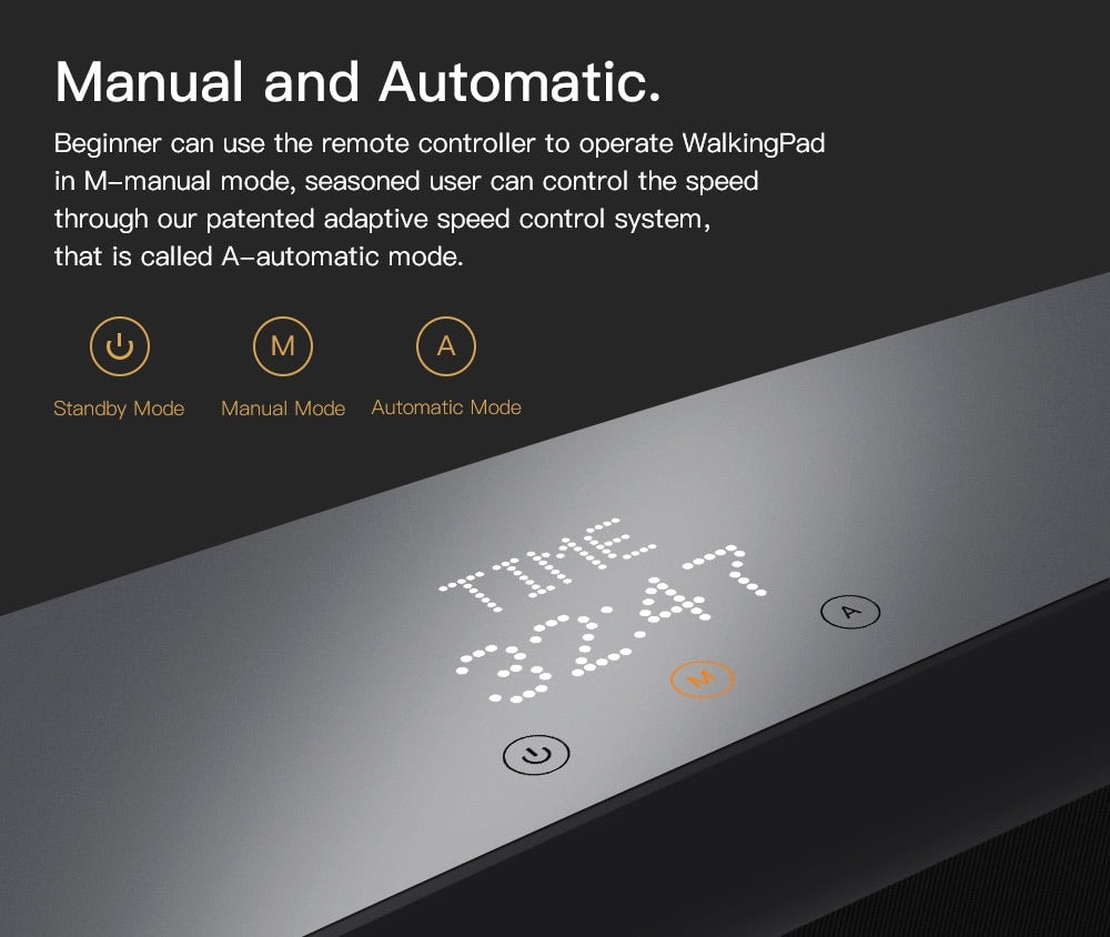 • Workout the way you want with 2 intelligent workout modes- Use M(Manual) mode Is operated by the remote controller to On/Off, Start/Stop, Acceleration/Deceleration. A(Auto)mode is operated by the user's footstep to Start/Stop, Acceleration/Deceleration.